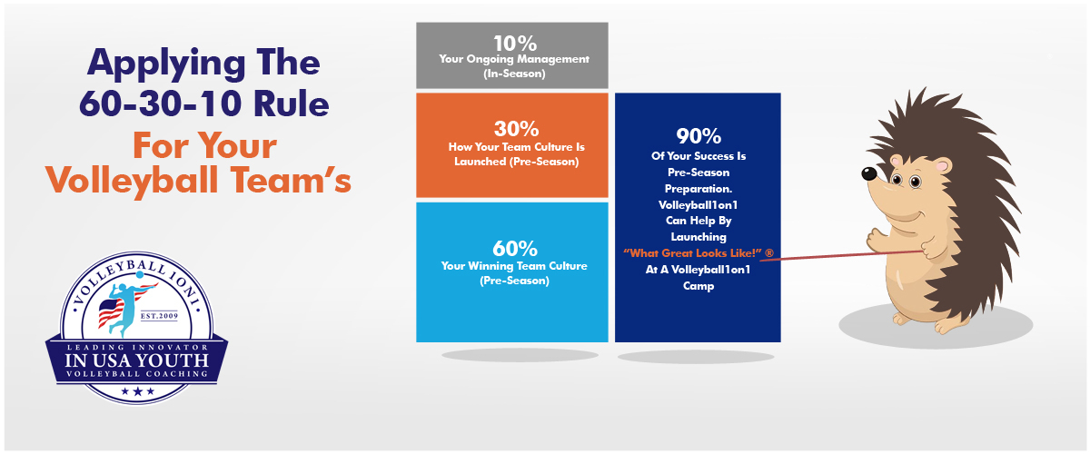 In the 60-30-10 rule, 60% of the variation in team effectiveness is attributable to the “design of the team,” 30% to the way the team is “launched,” and 10% to “ongoing coaching / management” once the team is underway. This means that 90% of your success / team effectiveness during your high school or club season is determined during the first few weeks of practice or before season even begins.