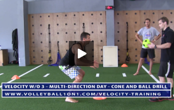 This video is a progression from the previous cone drill as now a ball is added to the exercise to make it more dynamic and volleyball game like. This forces the athletes to concentrate in new ways and use other skills to perform the exercise.