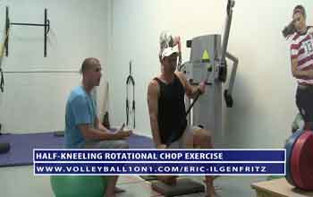 This is an upper body chop PNF pattern that helps develop trunk and lower body stability, upper body strength and rotary mobility executed from a half kneeling stance. In volleyball rotational stability is critical for many of the volleyball skills like spiking yet too few athletes really put attention into this important element of volleyball training and the result is often volleyball injuries.