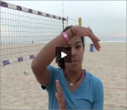 Priscilla demonstrates a court vision beach drill. The drill has the hitter use their peripheral vision to hit to a coach, without a call from the setter.